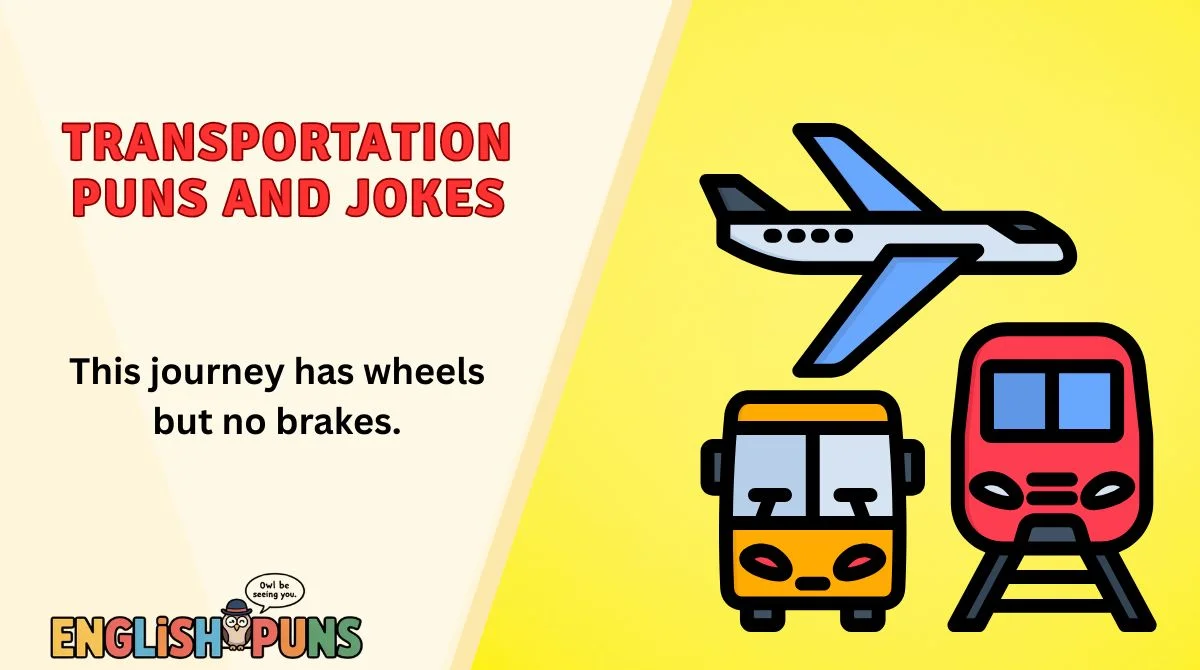 Transportation puns are jokes and wordplay based on cars, roads, travel, trains, planes, and commuting.