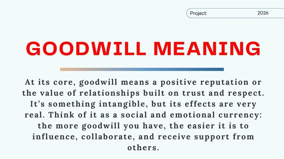 At its core, goodwill means a positive reputation or the value of relationships built on trust and respect. It’s something intangible, but its effects are very real. Think of it as a social and emotional currency: the more goodwill you have, the easier it is to influence, collaborate, and receive support from others.